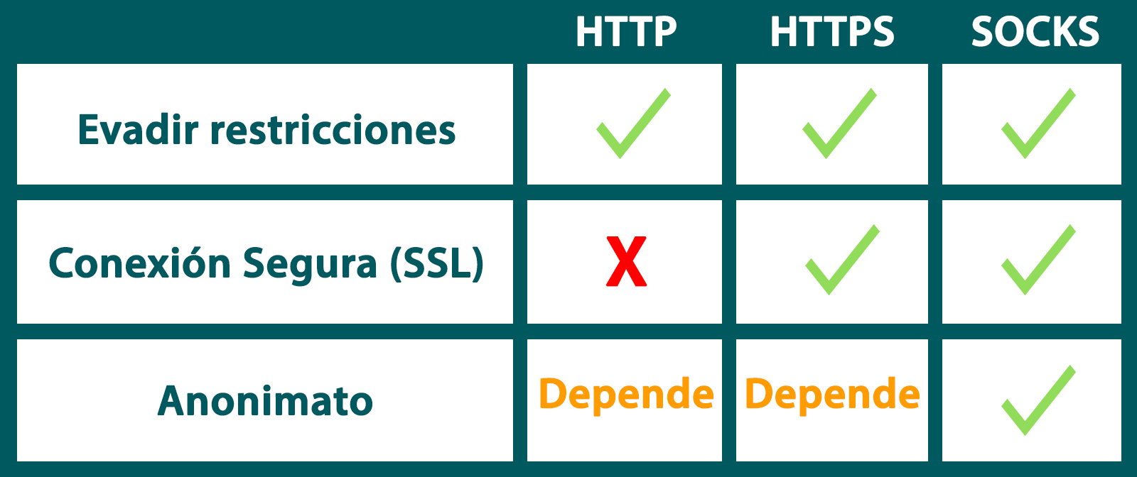 Existen varios tipos de proxy, en nuestro sitio web encontrarás 3 de ellos: HTTP, SSL/HTTPS Y SOCKS.